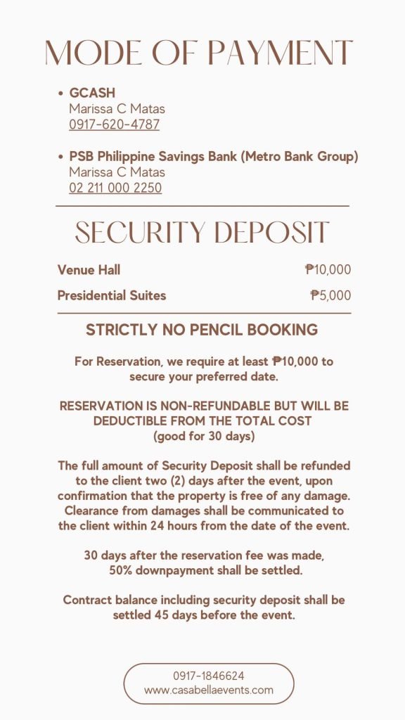 * Secure the reservation fee (Php 10,000) thru any of the following channels: